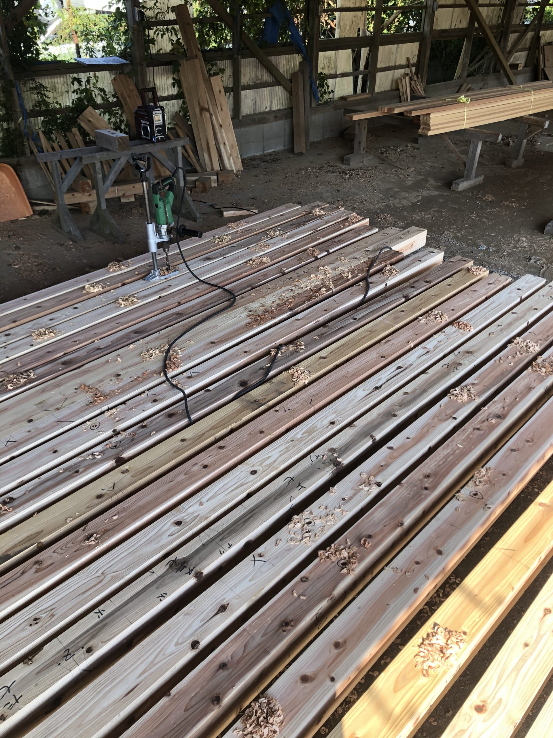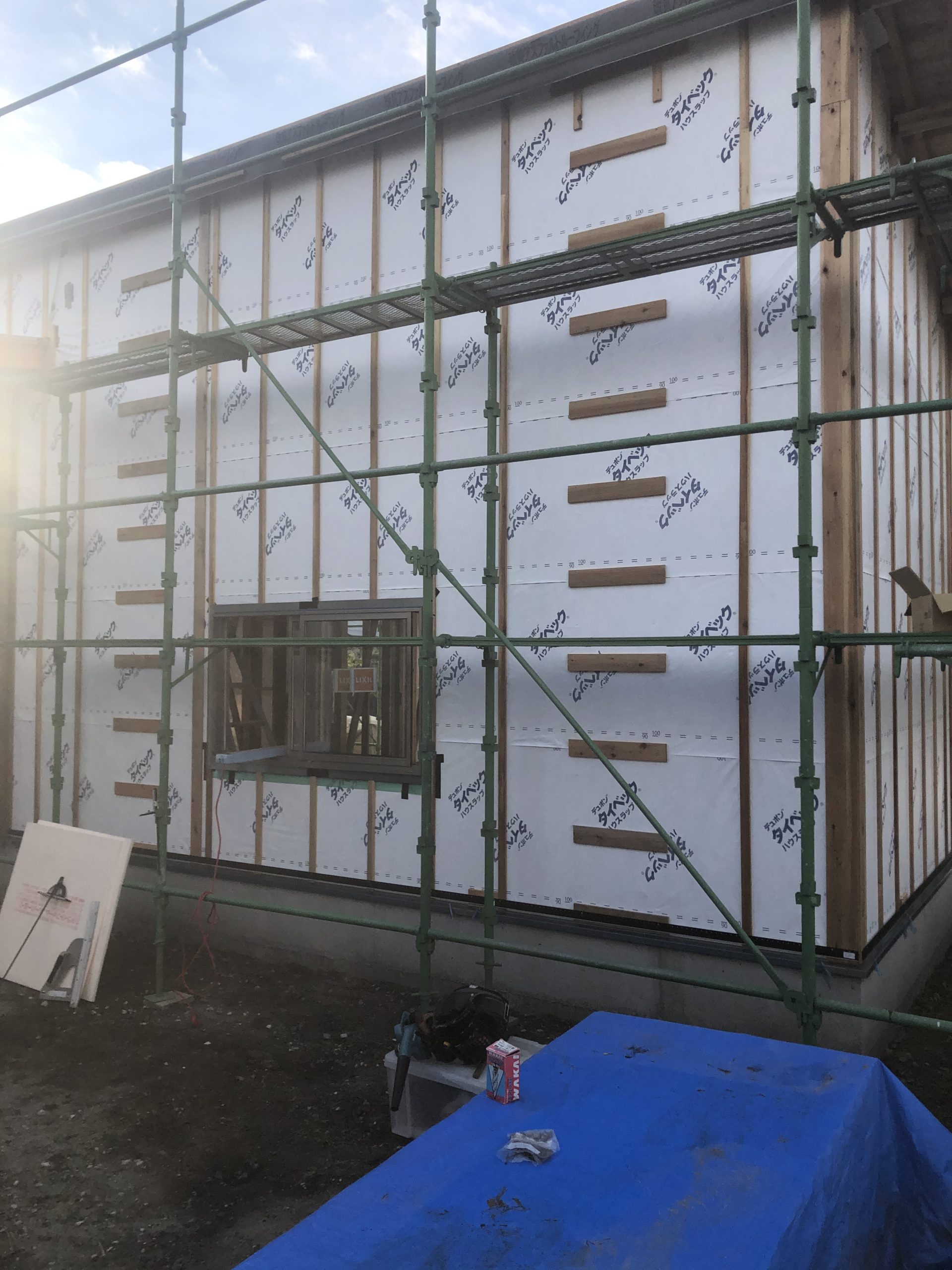 先日まで2日間友人大工さんの建て方の応援(付き合いヒジョーに大事)に行ってたので今日から外壁工事開始。