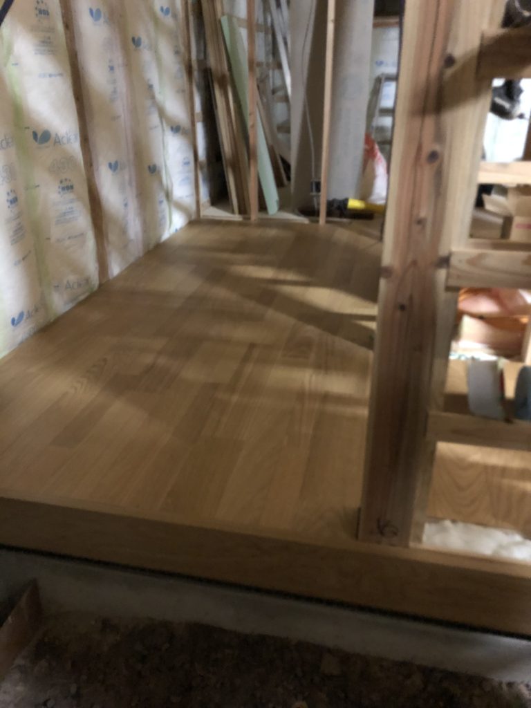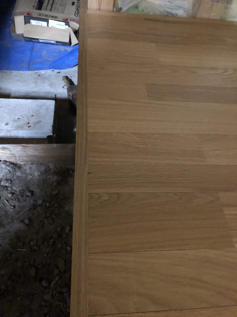 玄関幅木を取り付けたのでフリースペースの床を貼ることができます。
