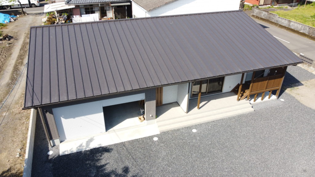 よしは建築工房の板金屋根は木下地屋根の上にスタイロフォーム(板状の断熱材)を敷いてその上からガルバニウム板金を施工してます。