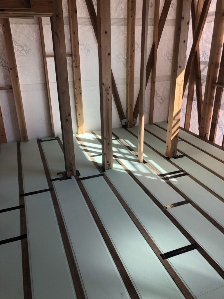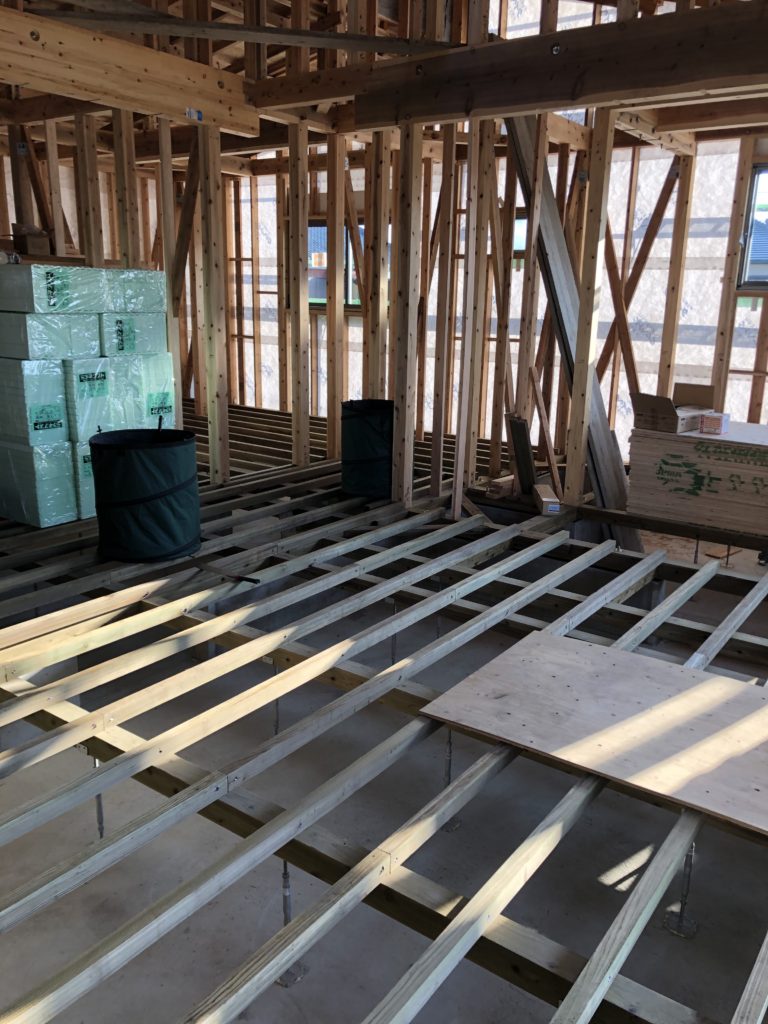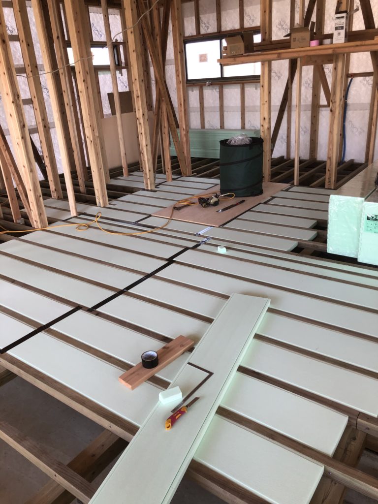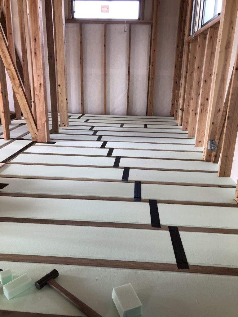 根太が終わったら40厚(4センチ)断熱材を敷き詰めます。